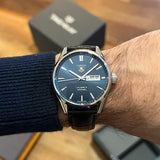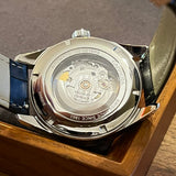 Dimensions: 41 mm diameter, 13 mm thickness, 20 mm lug width. Stainless steel case. Blue dial without numerals. Fixed steel bezel. Sapphire crystal.