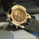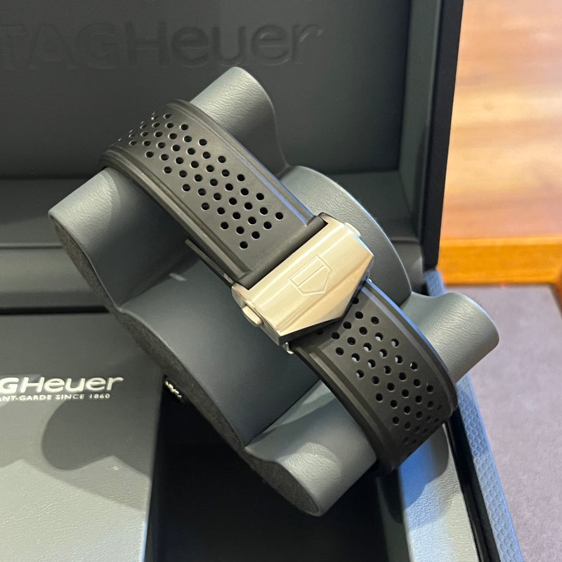 Diameter: 43 mm. Case in satin/polished steel and ceramic. Fixed black ceramic bezel. Black dial without numerals. Luminous hands and indices. Sapphire crystal. Automatic chronograph movement. Caliber Heuer 01. Transparent case back. Original black rubber strap from Tag Heuer. Steel deployment clasp with Tag Heuer emblem.