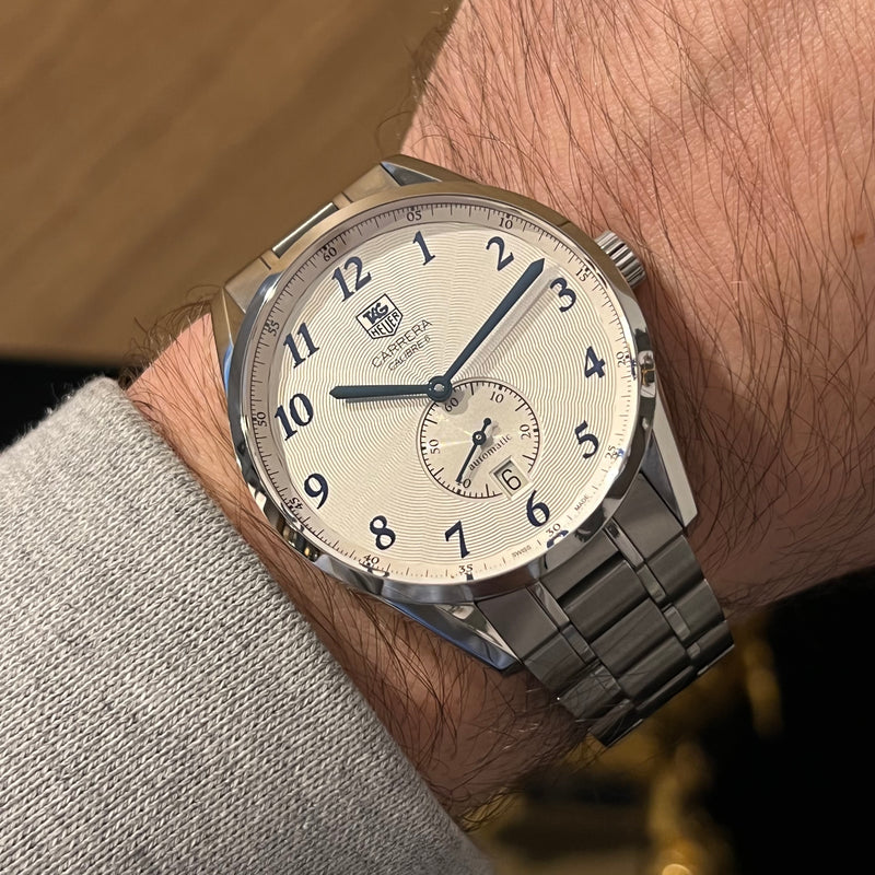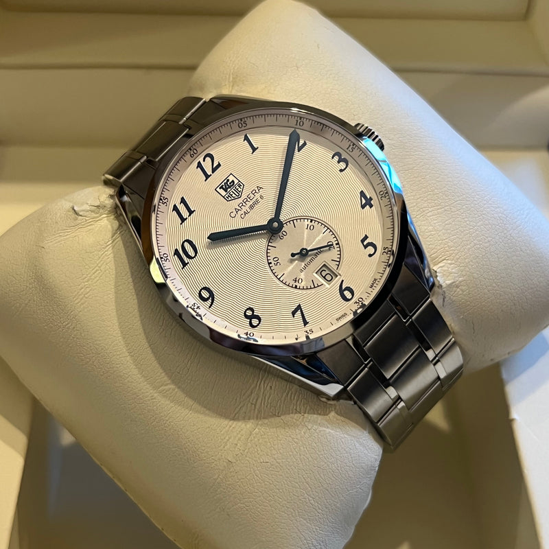 Diameter 39 mm. Wrist size 16.5 cm. Stainless steel case and bracelet. Smooth steel bezel. Textured silver dial with Arabic numerals. Blued hands and markers. Sapphire crystal. Automatic movement. Caliber 6. Transparent case back. Stainless steel folding clasp with Tag Heuer emblem.