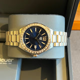 Diameter 35 mm. Wrist circumference of 18.8 cm. Stainless steel case and bracelet. Bezel set with 36 diamonds. Total of 0.277 carats. Sunray blue dial with Arabic numerals at 12 o'clock. Sapphire crystal. Quartz movement. Solid stainless steel case back with Tag Heuer emblem and engraving. Stainless steel folding clasp with sticker and Tag Heuer emblem.