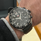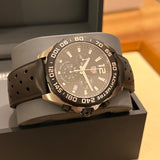 Diameter 43 mm. Stainless steel case. Fixed bezel in black PVD-coated steel. Black dial with Arabic numerals. Luminescent hands and indexes. Sapphire crystal. Quartz movement. Solid stainless steel case back with Tag Heuer emblem. Original black rubber strap by Tag Heuer. Steel pin buckle with Tag Heuer emblem.