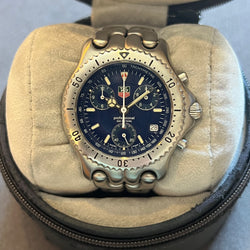Diameter 39 mm. Wrist circumference 16.7 cm. Stainless steel case and bracelet. Blue dial without numerals. Luminous hands and indexes. Sapphire crystal. Quartz chronograph movement. Stainless steel case back with Tag Heuer emblem. Stainless steel deployment clasp with Tag Heuer emblem.