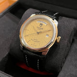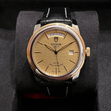 Diameter 39 mm. Stainless steel case. Smooth bezel in steel and yellow gold. Textured gold dial without numerals. Gold hands and indexes. Sapphire crystal. Mechanical automatic movement. Solid stainless steel case back with Tudor emblem. Replacement black leather strap non-original Tudor. Stainless steel folding clasp with Tudor emblem.