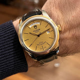 Functions: Hours, minutes, central seconds, day display at 12 o’clock, date display at 3 o’clock.