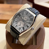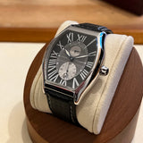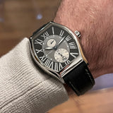 Diameter 38 mm * 43 mm. Stainless steel tonneau case. Smooth stainless steel bezel. Black dial with Roman numerals. Blued and luminescent hands. Sapphire crystal. Automatic movement. Solid stainless steel case back with Ulysse Nardin emblem. Non-original Ulysse Nardin replacement carbon strap. Stainless steel folding clasp with Ulysse Nardin emblem.