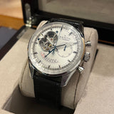 Diameter 42 mm. Stainless steel case. Smooth steel bezel. Silver open heart dial without numerals. Tachymeter scale. Luminous hands. Sapphire crystal. Automatic chronograph movement. Caliber El Primero 4021P. Transparent case back. Original Zenith black leather strap. Stainless steel double folding clasp with Zenith emblem.